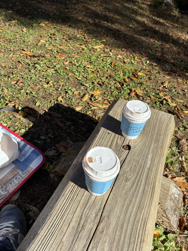 カフェに入れなかった場合まわりに飲食店がないので、私たちはドリンクのみカフェでテイクアウトして食事は持ち込みました。